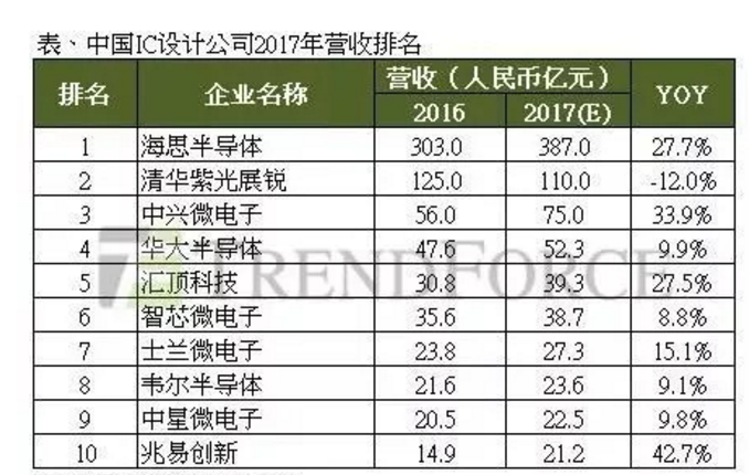 從個別IC設(shè)計公司2017年營收表現(xiàn)來看,海思受惠于母公司華為手機出貨的強勢增長,以及麒麟芯片搭載率的提升,2017年營收維持25%以上的年增率。