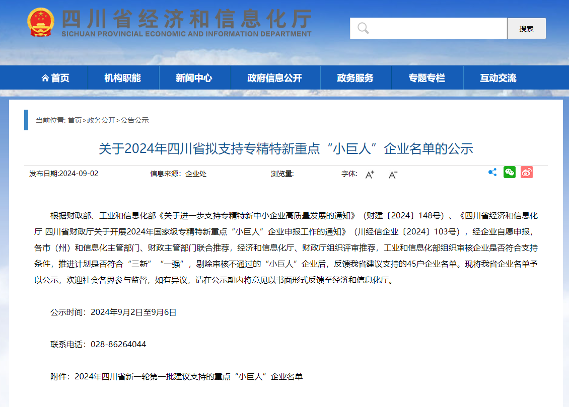 近日,四川省經(jīng)濟(jì)和信息化廳官網(wǎng)發(fā)布了2024年四川省******批國(guó)家級(jí)專精特新重點(diǎn) “小巨人”企業(yè)名單,共計(jì)45家。成都旋極星源信息技術(shù)有限公司(以下簡(jiǎn)稱“旋極星源”)位列其中。這是旋極星源繼國(guó)家級(jí)專精特新“小巨人”企業(yè)后獲得的更高殊榮。