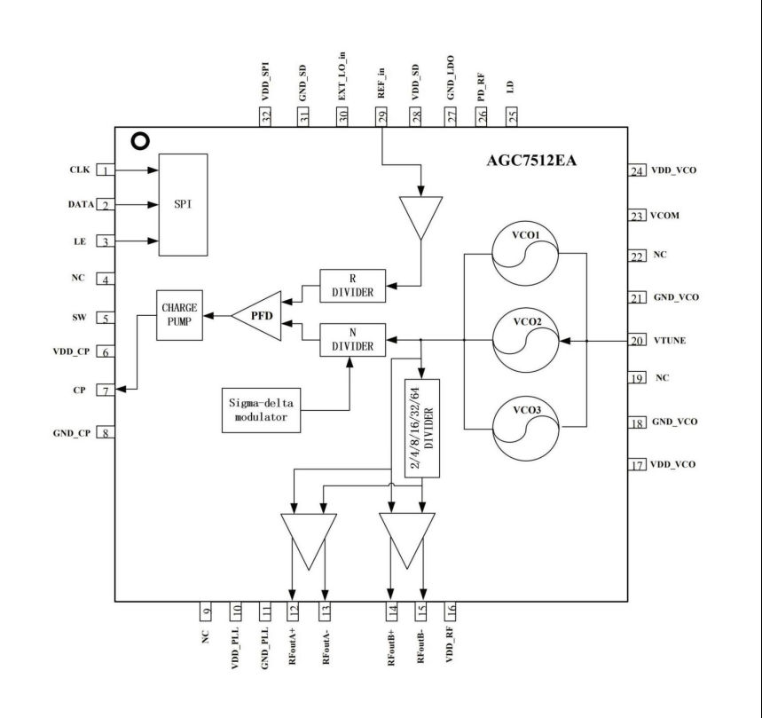 AGC7512EA是一款低噪聲、寬帶小數(shù)分頻頻率綜合器。內(nèi)部集成鎖相環(huán),壓控振蕩器,24bitsigma delta調(diào)制器和可編程輸出緩沖。外置晶體振蕩器和環(huán)路濾波器,其基頻輸出頻率范1300MHz~2700MHz,通過可編程的分頻設(shè)置可輸20MHz~6000MHz的射頻信號(hào)。